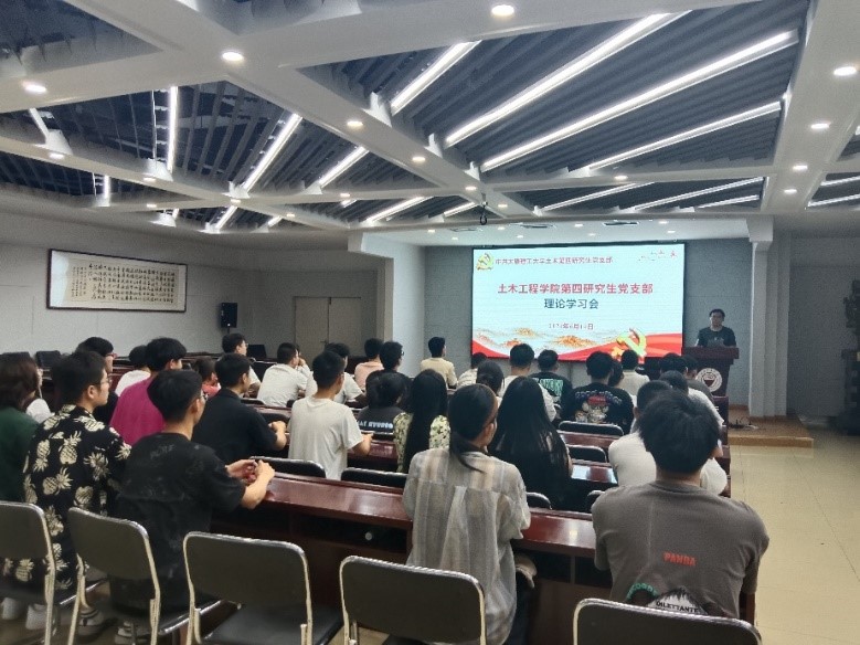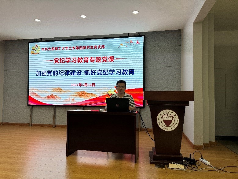 2024年6月14日,土木第四研究生党支部在学院五层会议室召开党纪学习教育专题学习会,深入学习贯彻习近平总书记关于党纪学习教育的重要讲话精神和重要指示精神,组织学习新修订的《中国共产党纪律处分条例》。会议由支部副书记闫鑫伟主持,支部书记邱斌、组织委员兰曈、宣传委员张英英及土木第四研究生党支部全体党员参加。